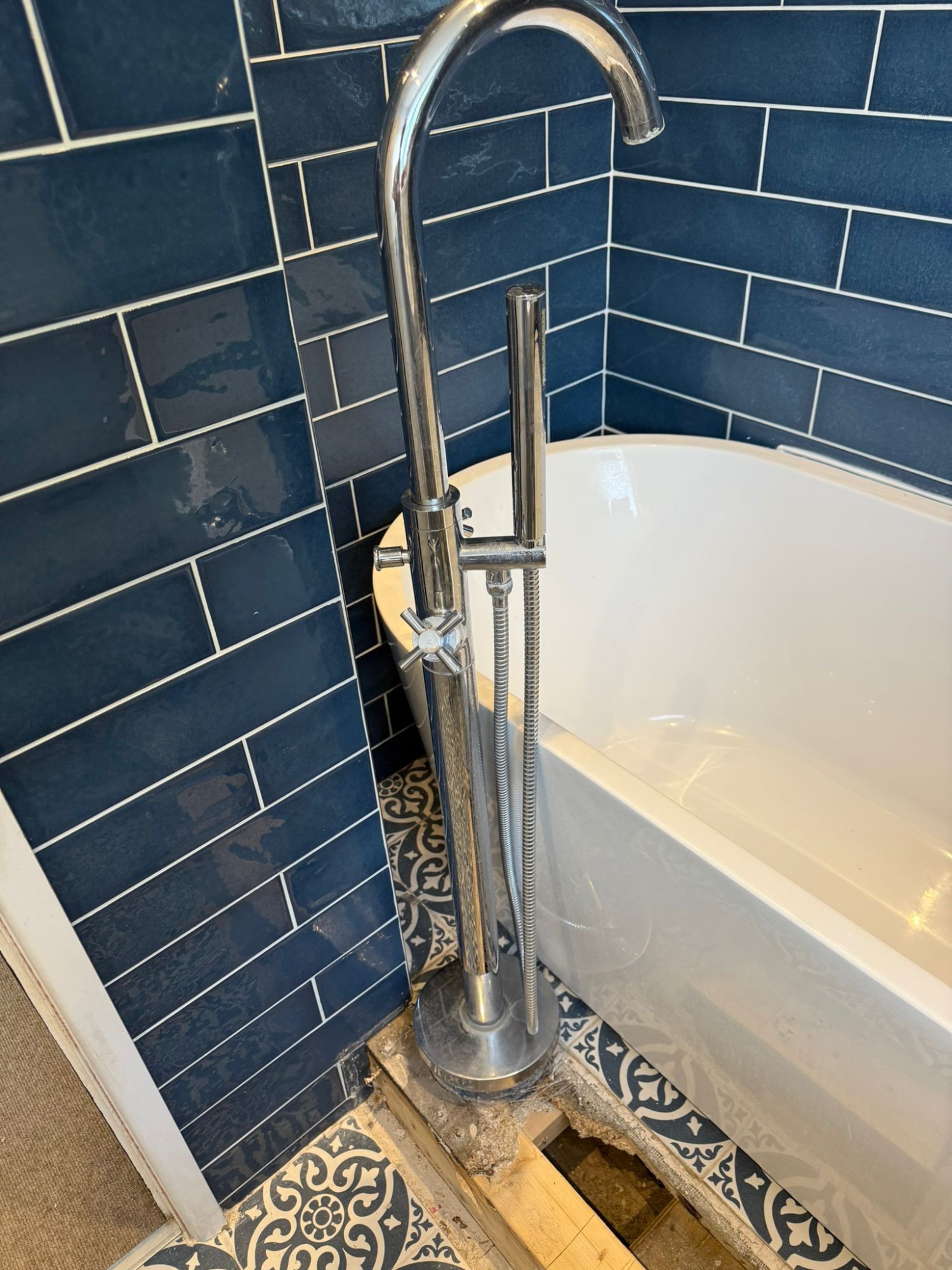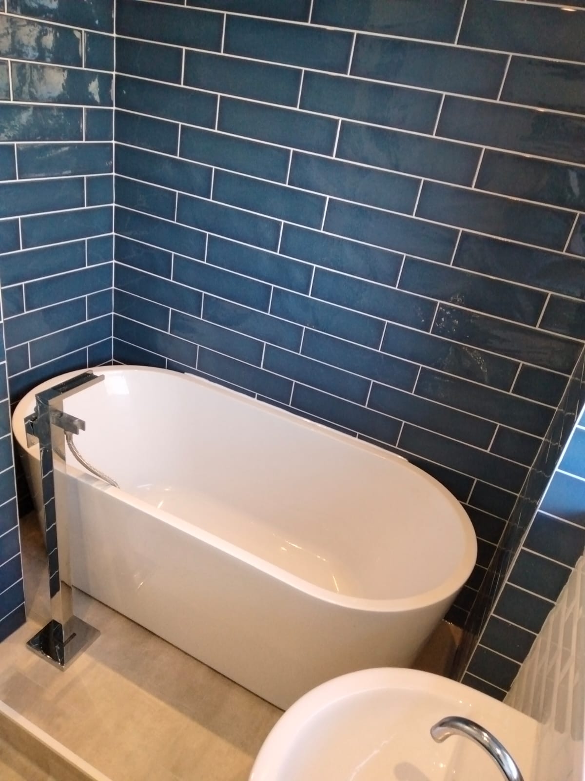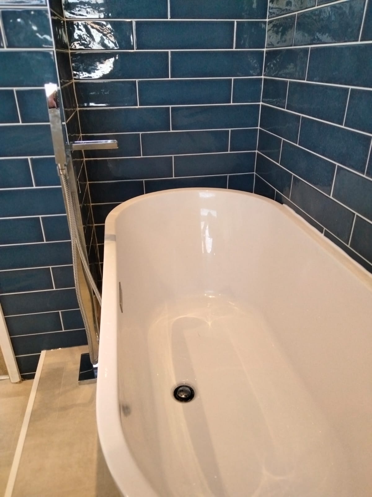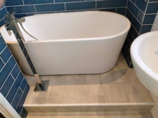 This bathroom makeover introduced fresh flooring and a bespoke raised platform, creating a striking focal point for the bath. Finished with a modern floor-mounted tap, the space now feels contemporary and refined.